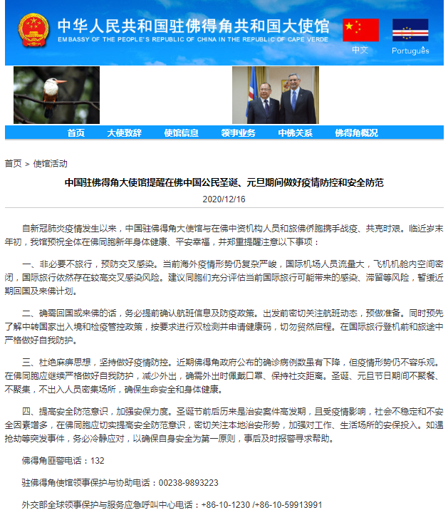 自新冠肺炎疫情发生以来,中国驻佛得角大使馆与在佛中资机构人员和旅佛侨胞携手战疫、共克时艰。临近岁末年初,我馆预祝全体在佛同胞新年身体健康、平安幸福,并郑重提醒注意以下事项: