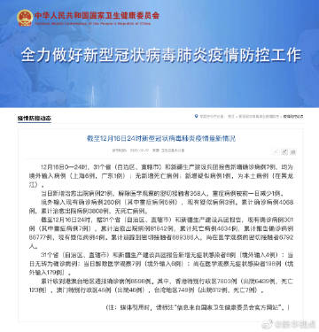 截至12月16日24时,据31个省(自治区、直辖市)和新疆生产建设兵团报告,现有确诊病例301例(其中重症病例7例),累计治愈出院病例81842例,累计死亡病例4634例,累计报告确诊病例86777例,现有疑似病例4例。累计追踪到密切接触者889386人,尚在医学观察的密切接触者6792人。