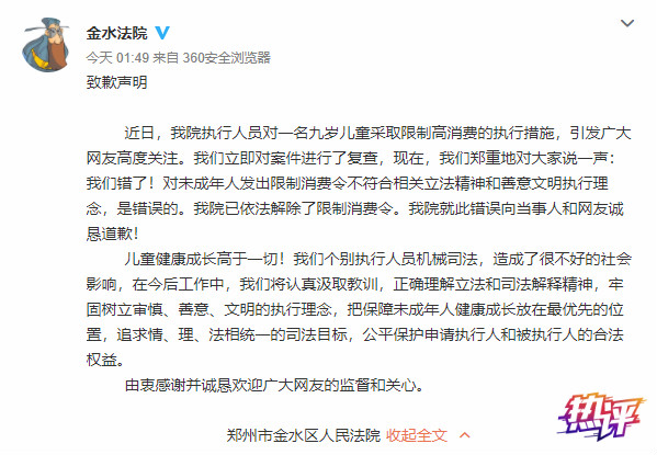日前,河南省郑州市金水区法院执行人员对一名9岁儿童采取限制高消费的执行措施,引发广泛关注。12月16日,金水区法院官微发布致歉声明,表示法院经过复查,已依法解除了限制消费令,并就此错误向当事人和网友诚恳道歉:“我们错了!”