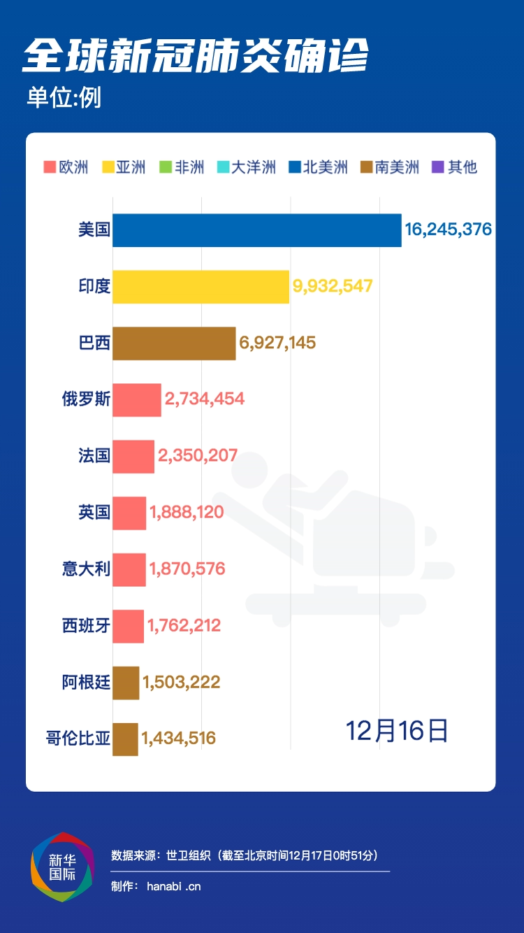 世界卫生组织:截至欧洲中部时间16日17时51分(北京时间17日零时51分),全球新冠确诊病例较前一日增加585455例,达到72196732例;死亡病例增加11463例,达到1630521例。