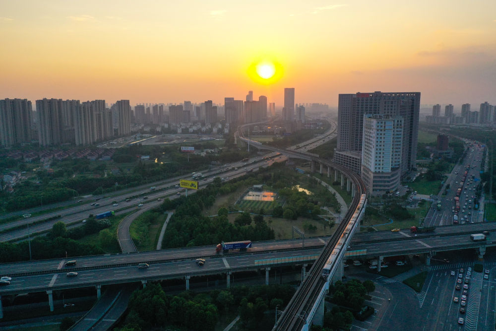 列车行驶在上海轨道交通11号线北段延伸工程花桥段(上海安亭站至昆山花桥站)兆丰路站附近。新华社记者 季春鹏 摄