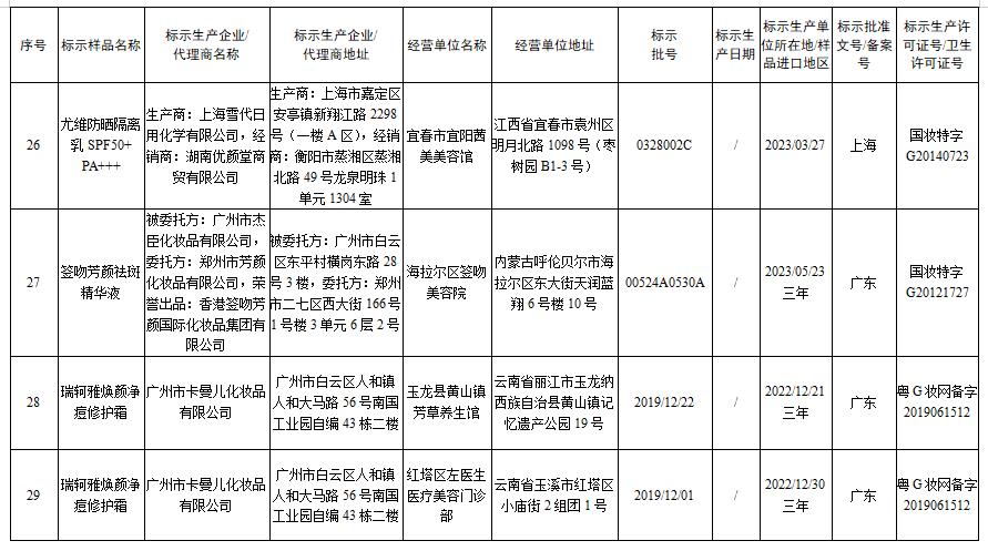 今日(17日),国家药监局发布关于31批次假冒化妆品的通告。针对化妆品监督检查中发现的问题,经上海、广东省(市)药品监督管理部门调查核实,标示名称为汉雅润黑染发露(黑色)等25批次染发类产品,标示名称为尤维防晒隔离乳SPF50+ PA+++ 1批次防晒类产品,标示名称为皙之源莹润雪肌冰膜1批次面膜类产品,标示名称为签吻芳颜祛斑精华液1批次祛斑/美白类产品(非面膜类产品),标示名称为瑞轲雅焕颜净痘修护霜等2批次宣称祛痘/抗粉刺类产品,标示名称为苗丝汇营养液(养发型)1批次养发/育发类产品为假冒产品。