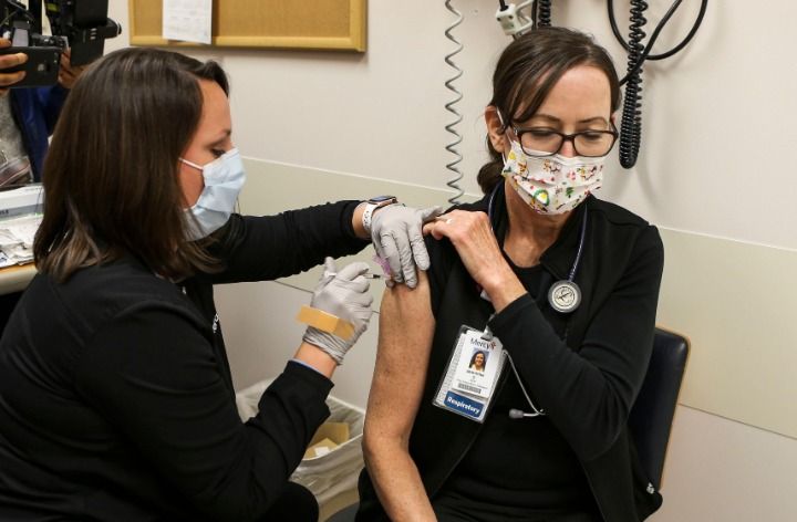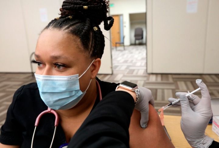12月14日,在美国圣路易斯一家医院,一名医护人员接种新冠疫苗。新华社/美联