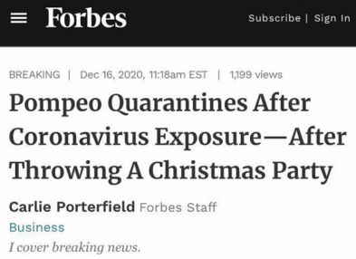 △《福布斯》指出,蓬佩奥在进行自我隔离前数小时,刚刚参加了美国国务院的室内节日晚会