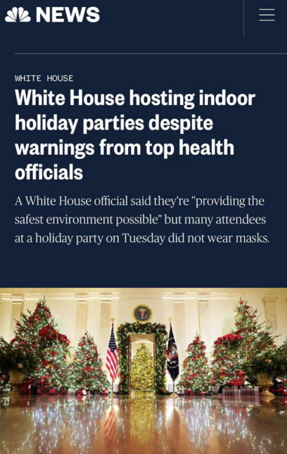 △美国全国广播公司报道,节日期间,白宫计划举办多达20场室内聚会