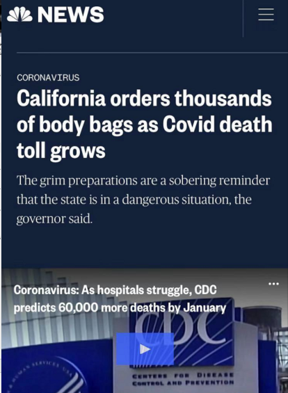 △美国全国广播公司报道,为应对医院系统崩溃,加州日前订购了5000个裹尸袋,60个冷藏柜