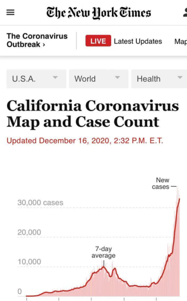 △《纽约时报》指出,加利福尼亚州过去七天中,平均每天有32808例新增确诊病例,高居全国之首