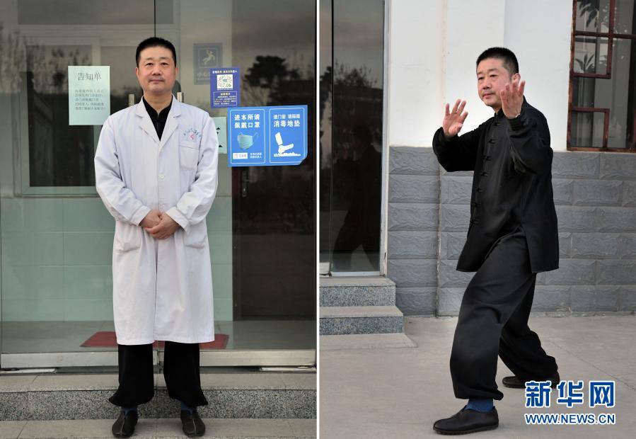 拼版照片:左图为穿着白大褂的陈绍杰;右图为陈绍杰在卫生室门前练习太极拳(12月14日摄)。45岁的陈绍杰是陈家沟卫生室的村医,练习太极拳35年,工作之余免费教100多名拳友练太极拳。