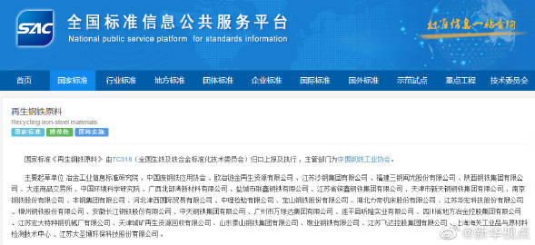 【《再生钢铁原料》国家标准2021年将实施】记者17日从中国钢铁工业协会了解到,《再生钢铁原料》国家标准已于近日正式发布,并将于2021年1月1日起正式实施。该标准将最大限度挖掘国际和国内再生钢铁原料资源,提高铁素资源循环利用率,增加钢铁企业有效选项,一定程度上抑制对铁矿石的使用和价格的上涨。(记者谢希瑶)