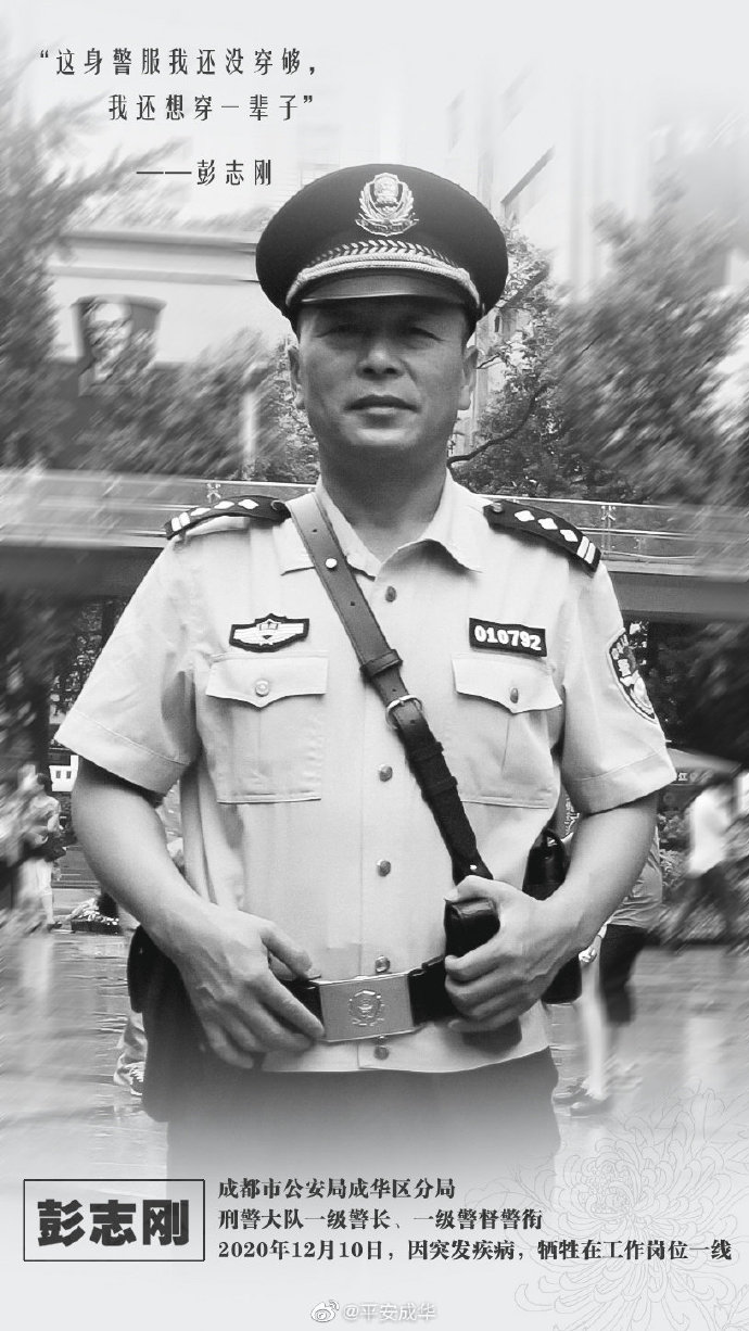 2020年12月10日9时40分,成都市公安局成华区分局刑警大队民警彭志刚在工作中突发疾病晕倒在地,经送医院全力抢救无效,于当日11时58分不幸牺牲,终年54岁。