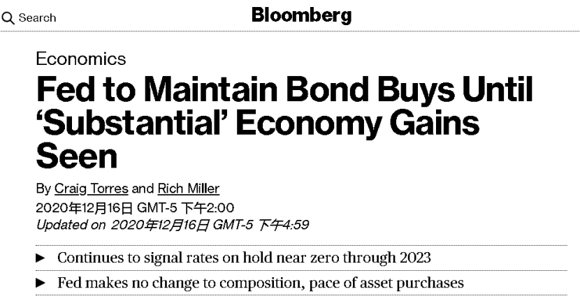 美联储12月16日结束为期两天的政策会议,在会后发表的货币政策声明中,美联储称将基金利率维持在0~0.25%的区间不变,继续每月至少购买1200亿美元债券,直至在实现最大就业和价格稳定目标方面取得实质性进展。美联储认为,资产购买计划有助于促进平稳的市场运作和宽松的金融条件,从而支持信贷流向家庭和企业。