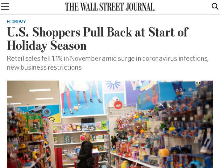 《华尔街日报》分析称,美国11月零售额自4月以来首次环比下滑,与疫情恶化导致新的商业限制措施有关,在这种情况下,美国消费者支出减少,特别是在假日季减少购物。