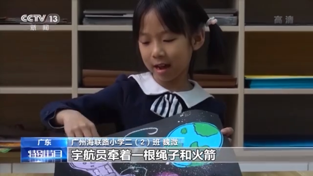 广州海联路小学二(2)班 魏溦:我画的是一整个宇宙,这个火箭叫嫦娥五号,然后这个是中国的宇航员,宇航员牵着一根绳子站在月球上,月球上还有个小机器人在采石头,这里是地球,这里还有很多的流星和半个太阳,有一些小星球。
