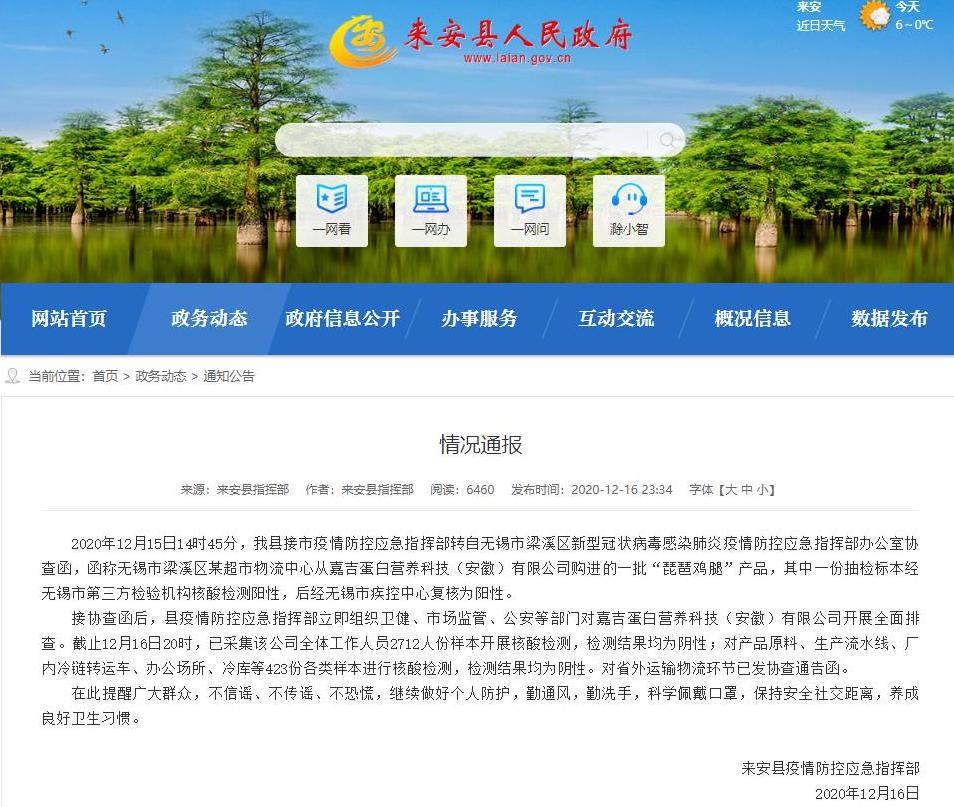接协查函后,来安县疫情防控应急指挥部立即组织卫健、市场监管、公安等部门对嘉吉蛋白营养科技(安徽)有限公司开展全面排查。截至12月16日20时,已采集该公司全体工作人员2712人份样本开展核酸检测,检测结果均为阴性;对产品原料、生产流水线、厂内冷链转运车、办公场所、冷库等423份各类样本进行核酸检测,检测结果均为阴性。对省外运输物流环节已发协查通告函。