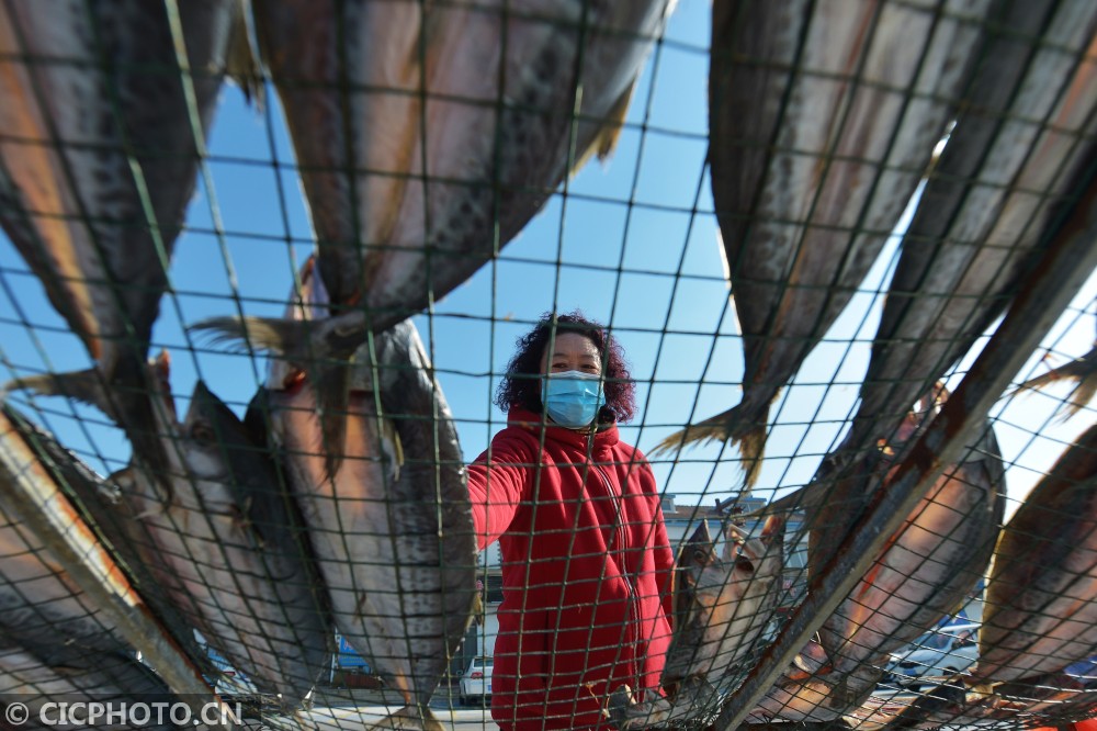↑2020年12月16日,在山东省青岛市崂山区一处渔村,渔民在晾晒风味鱼干。CICPHOTO/王海滨 摄
