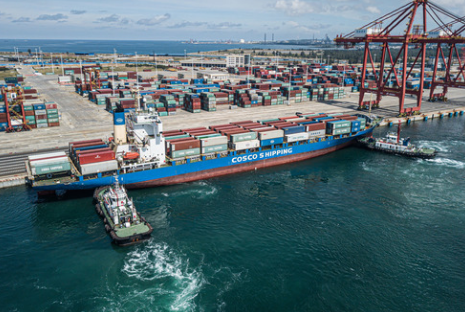 图为一艘中远海运集装箱货轮在两艘拖轮的辅助下,靠泊进海南洋浦小铲滩码头(无人机照片)