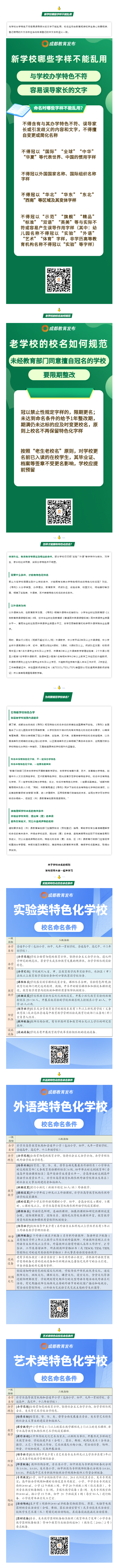 为进一步健全教育现代化治理体系,推进全市特色化校名与学校内涵建设相匹配,近日,成都市教育局印发《成都市特色化校名命名导则(2020年版)》(以下简称导则),明确今后冠以“实验”“外语”“艺术”“体育”等特色化字样的普通中小学、幼儿园和非学历高等教育机构(以下简称学校)必须符合《导则》规定的条件。同时也明确,按照“老生老校名”原则,对学校更名前已入读的在校学生,其毕业证、档案等签章不受更名影响,学校应提前预留。