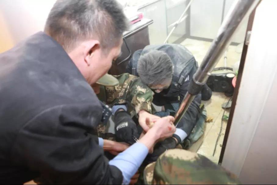 此时,歹徒还在负隅抵抗,民警利用防暴叉压住歹徒,并打落其手上的菜刀和匕首,最终成功将歹徒牢牢控制住,被其控制的两名人员被安全解救。
