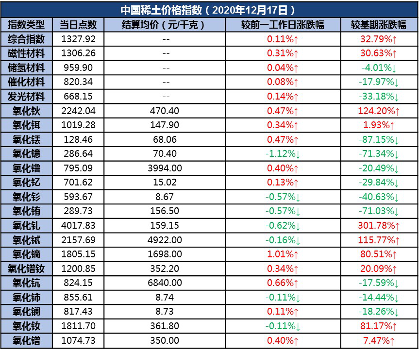 新华财经北京12月17日电(刘星麟)17日,中国稀土价格指数报1327.92点,较前一工作日上涨1.44点,涨幅为0.11%。氧化镨钕价格上涨,部分磁材企业库存临近低位,补库需求尚存,询单略显活跃,谨慎按需采购。