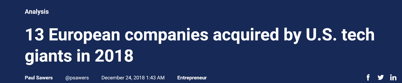 △美国互联网产业新闻博客网站在2018年12月24日发表文章《仅在2018年,美国科技巨头就收购了13家欧洲公司》