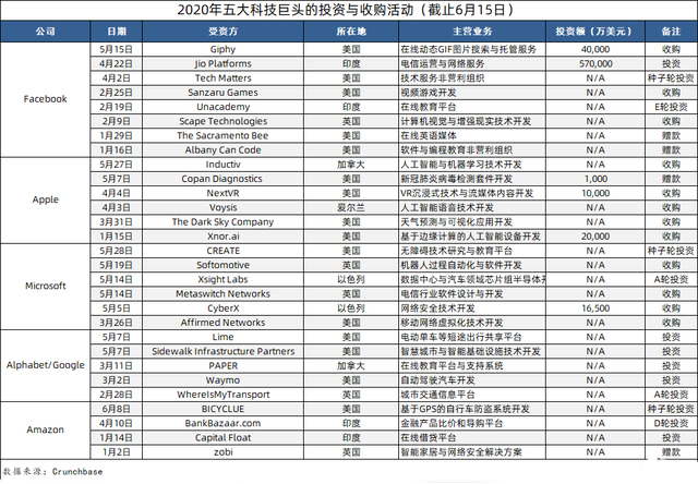 △Crunchbase统计,截至2020年6月15日,美国五大科技巨头在全球进行的收购项目。
