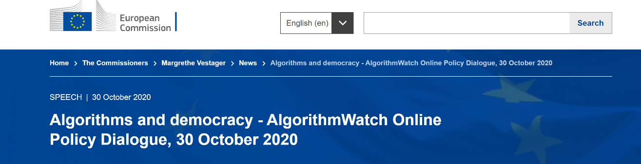 △早在2020年10月30日,欧委会就在其官网上公布,关于“算法与民主”的在线会议会议纪要。会议中,欧委会成员对欧盟数字服务与数字市场的内容进行了讨论。
