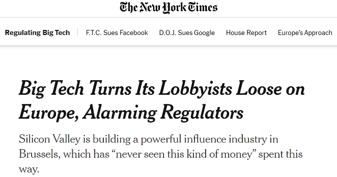 △《纽约时报》12月14日刊文称,《美国科技巨头试图将美国的“游说”策略带到欧洲,令欧盟监管部门感到震惊》