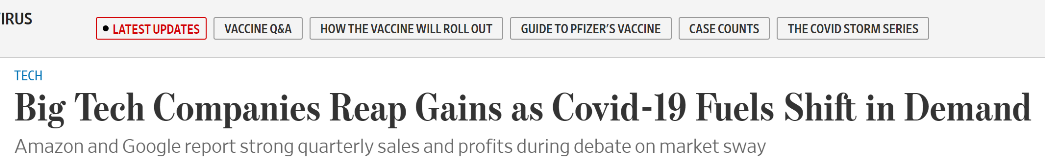 △《华尔街邮报》发表文章,《科技巨头在新冠肺炎大流行期间赚得盆满钵满——亚马逊和谷歌在关于市场动荡的辩论中报告了其强劲的销售额和利润》