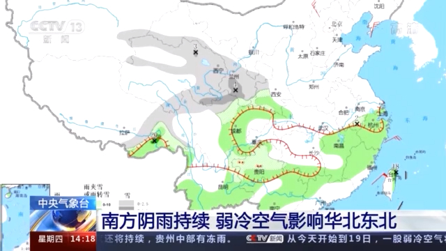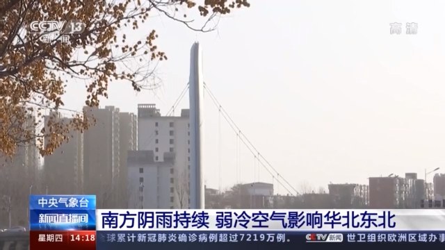 中央气象台预报显示,未来三天,我国南方大部仍被阴雨笼罩,回温乏力,贵州中北部的部分地区有冻雨,要注意防范。从今天(17日)开始,一股弱冷空气将给东北、华北带来小幅降温。