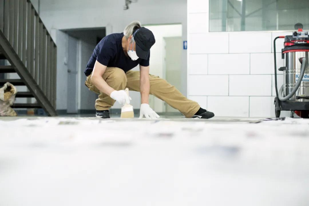 他开始等待。等待施工扬起的灰尘飘落。随后,他小心翼翼地取走积满灰尘的工具或工地弃物。画布上只留下灰尘,还有工具和弃物的留痕。
