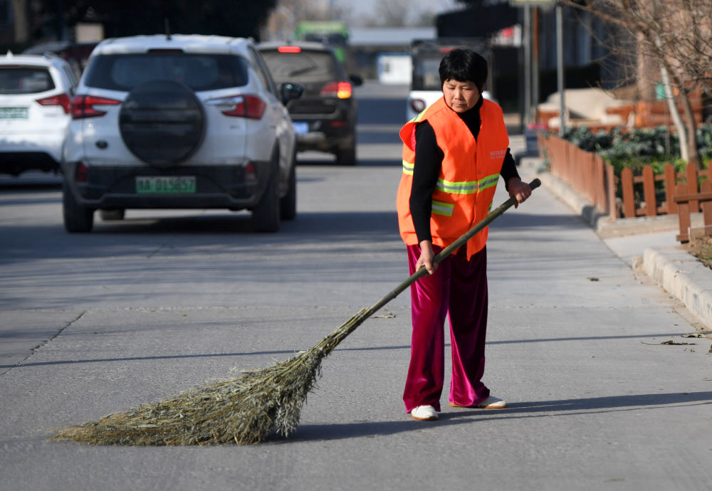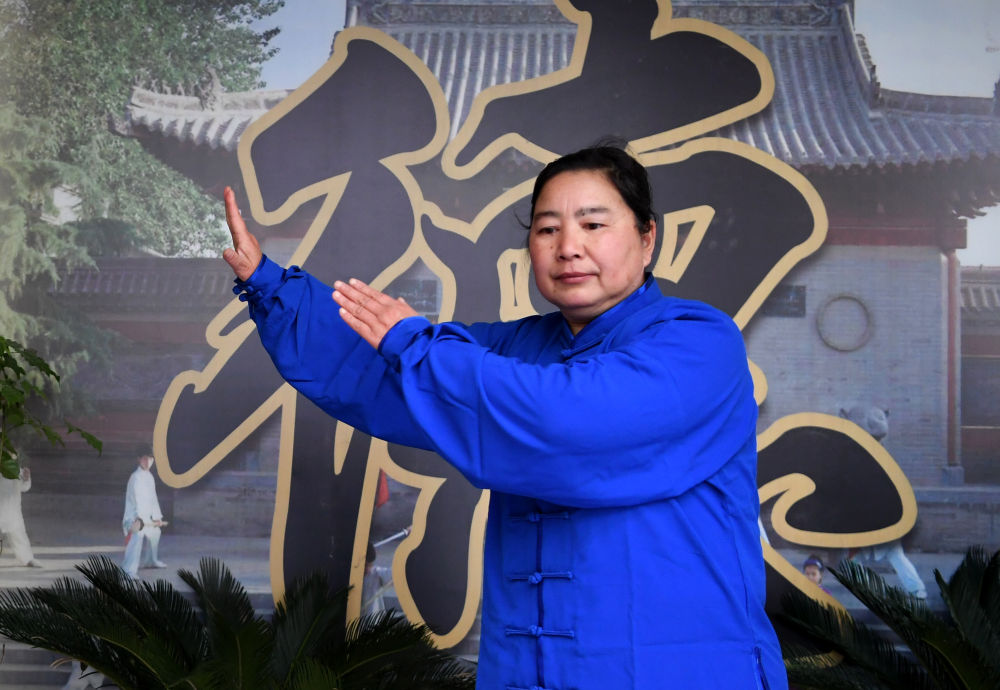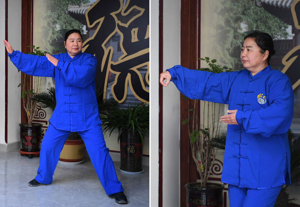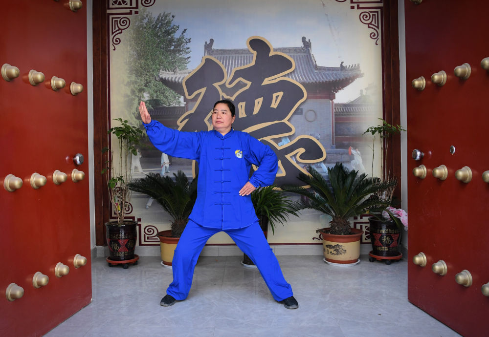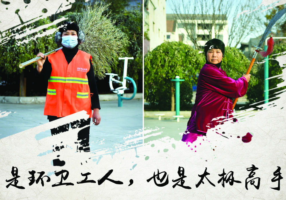 ↑62岁的黄春英是陈家沟的环卫工人,12岁开始习拳,除了太极拳外,还会太极双刀,太极春秋大刀等。