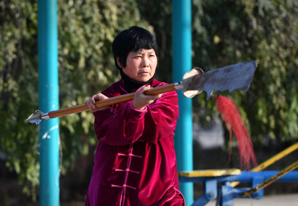 ↑黄春英在村里的小广场上练习太极春秋大刀(12月14日摄)。