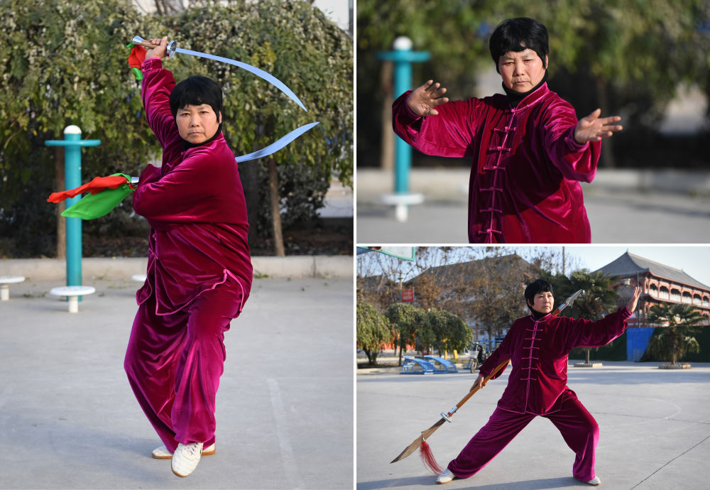↑拼版照片:左图为黄春英在练习太极双刀;右上为黄春英在练习太极拳;右下为黄春英在练习太极春秋大刀(12月14日摄)。