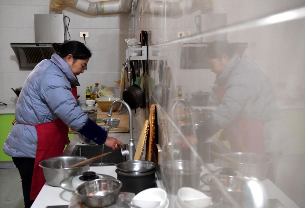 ↑吴平利在民宿厨房内为住客准备晚饭(12月13日摄)。