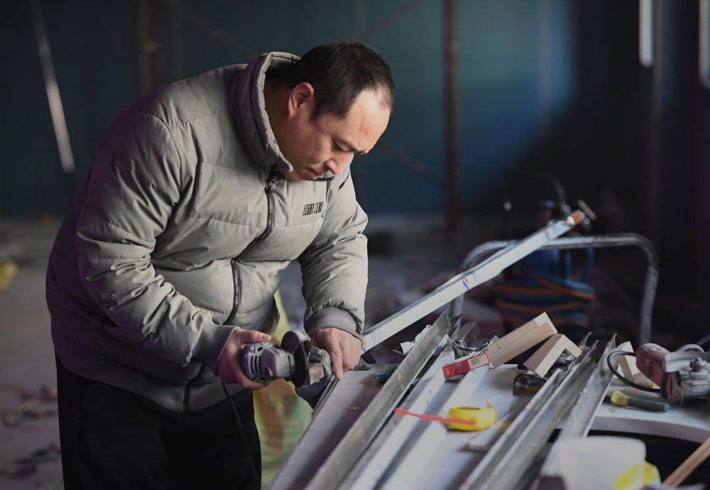 ↑装修工人吴波在施工现场切割不锈钢材(12月14日摄)。