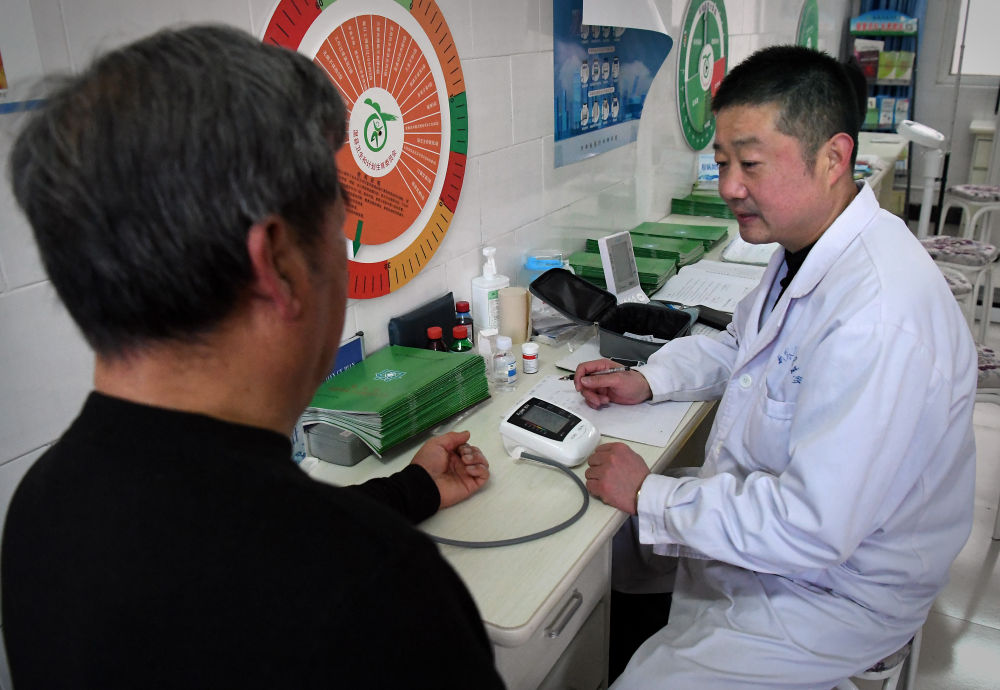 ↑陈绍杰在陈家沟卫生室内为村民测量血压(12月14日摄)。