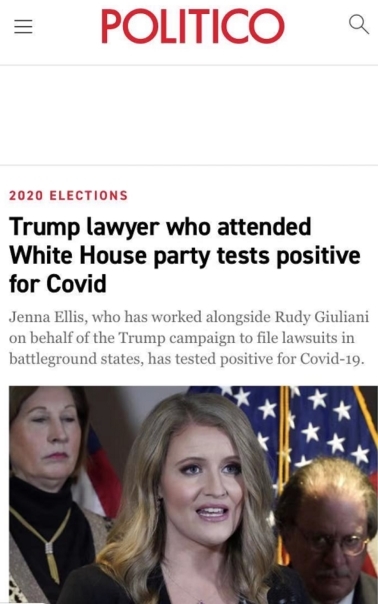 美国全国广播公司报道,也是在同一节日期间,白宫计划举办多达20余场室内聚会。在特朗普私人律师朱利安尼刚成为总统身边第53位被确诊的病例之后,与他一起负责特朗普竞选上诉活动的詹娜·埃利斯也很快确诊。而在埃利斯被确诊之前,她仍参加了一场白宫聚会,这令一同出席聚会的白宫官员深表担心。