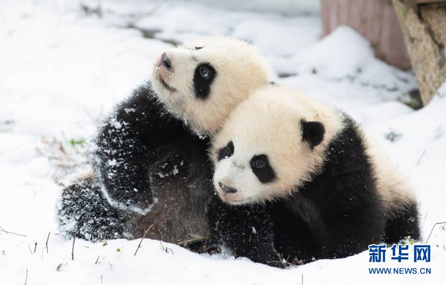 12月17日,两只大熊猫幼崽在中国大熊猫保护研究中心卧龙神树坪基地的雪地里嬉戏。