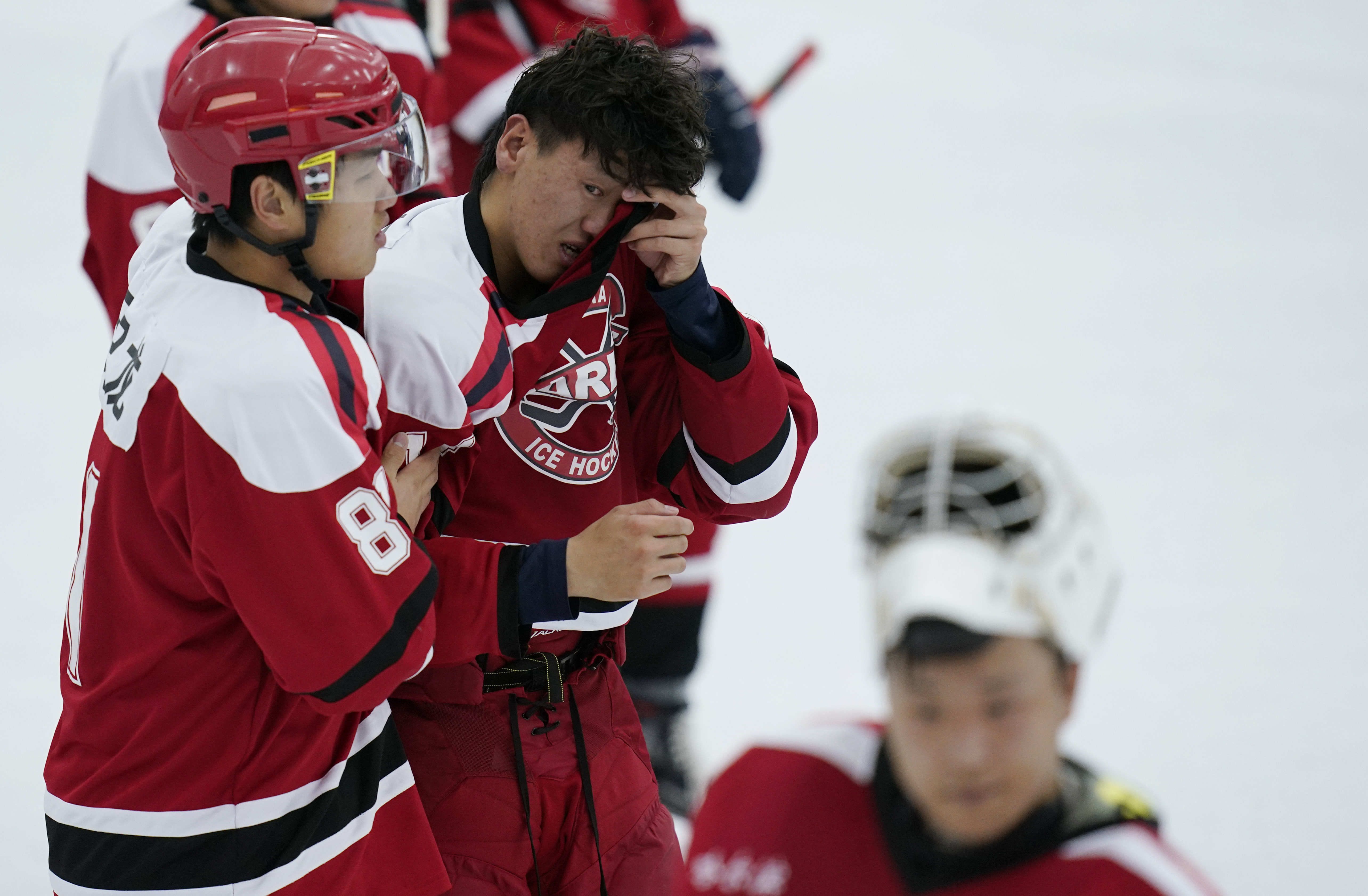 12月13日,哈尔滨队球员黄千一(中)在比赛后落泪。当日,在云南腾冲举行的全国冰球锦标赛男子组决赛中,经过点球大战,北京体育职业学院队以3比2战胜哈尔滨队,获得冠军。新华社记者王鹏摄