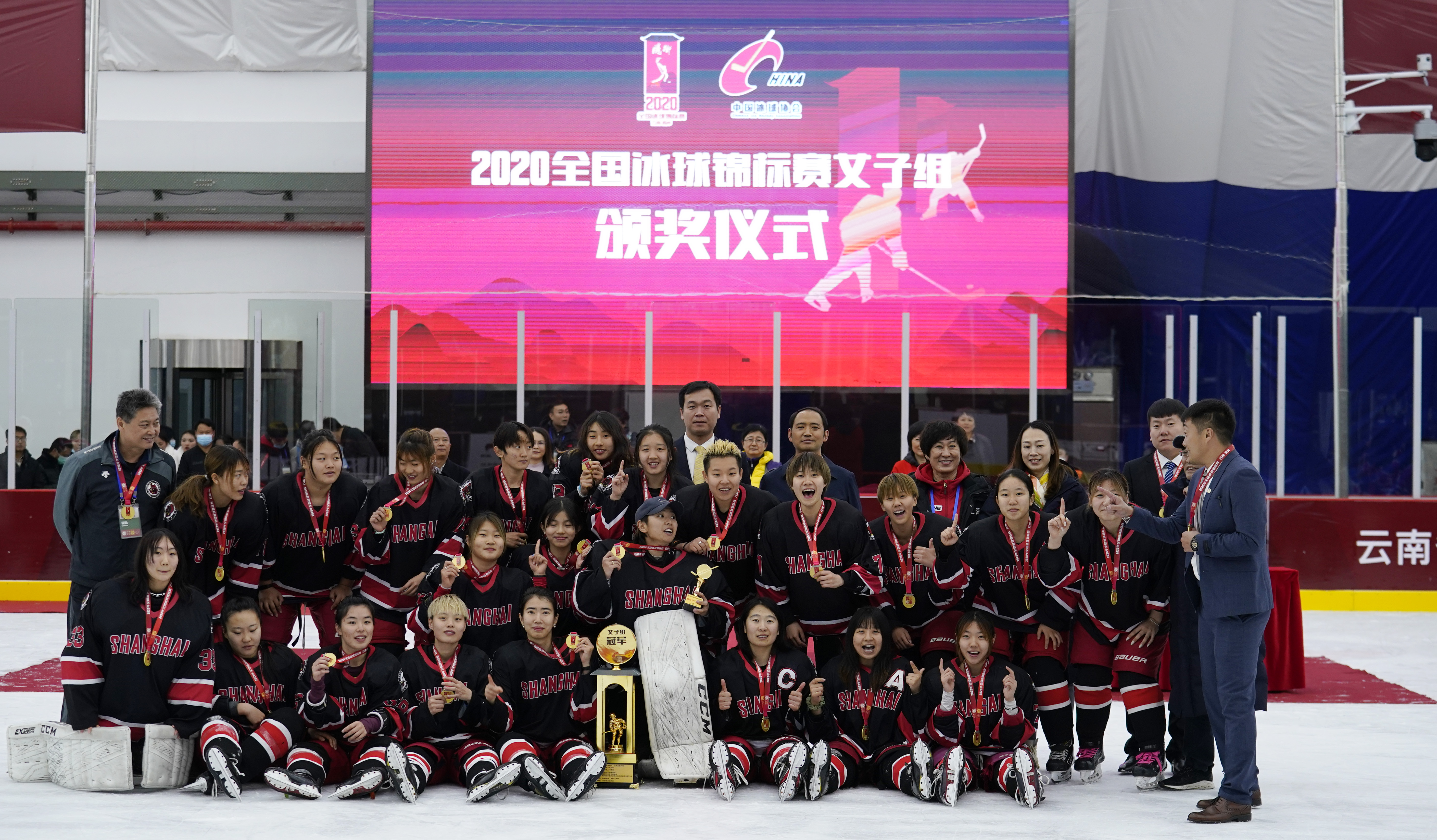 12月6日,上海队在颁奖仪式上合影。当日,在云南腾冲举行的全国冰球锦标赛女子组决赛上海队对阵哈尔滨队的比赛中,由于质疑裁判判罚,哈尔滨队在第二节比赛过程中拒绝上场比赛,裁判宣布比赛结束。最终,上海队以5比2战胜哈尔滨队,获得冠军。新华社记者王鹏摄