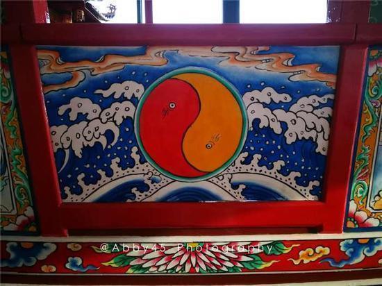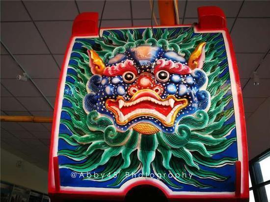 船头正面为狮头图案,并按规矩在两侧插上旗子,此谓左青龙、右白虎。
