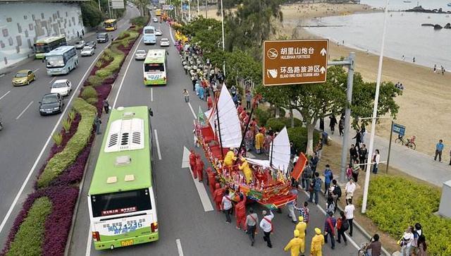 送王船的巡境之旅,要从沙坡尾出发,沿着大学路、蜂巢山路、思明南路、演武路、环岛路一路抵达海边。它绕境厦港一带社区,也寓意着要庇护这一方的风调雨顺。所到之处,人们都会前来围观祭拜,向神明许愿祈福。