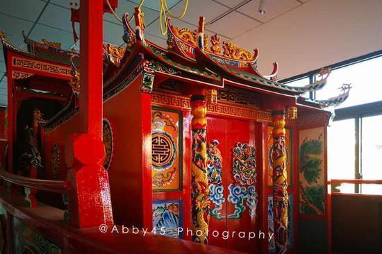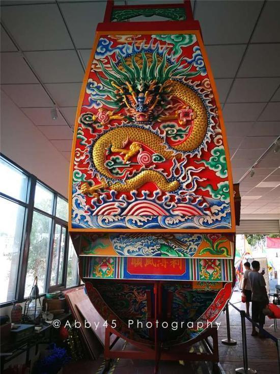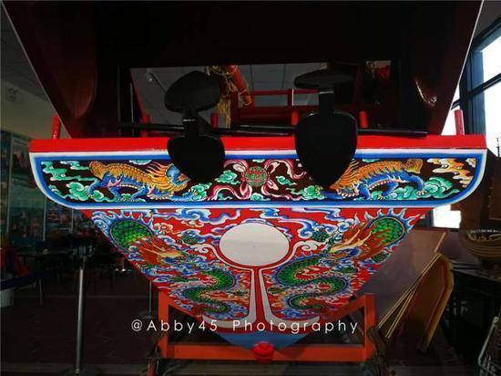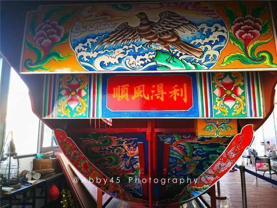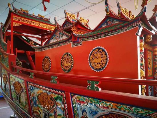 厦港龙珠殿理事黄锡源说,这非常考验师傅的功力:弧度过大,“肋骨”的承受能力降低,易折断;弧度过小则减少了船舱容积。而钟庆丰精湛的造船手艺,使得这艘王船的弧度恰到好处。船尾正面则绘上大龙,船前后竖有“代天巡狩池府千岁”的红色号旗。