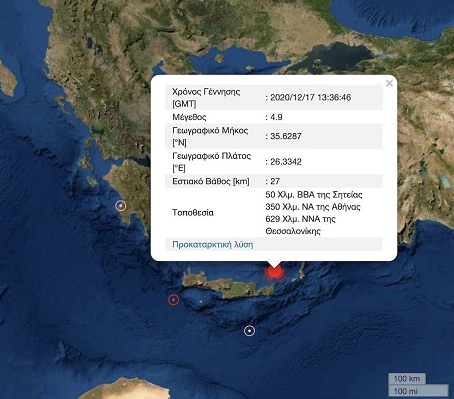 当地时间12月17日,据雅典国家天文台地球动力研究所消息,当日下午15时36分,希腊克里特岛附近海域发生里氏4.9级地震。震中位于锡蒂亚西北50公里处,震源深度27公里。当日上午9时19分,希腊克里特岛附近海域发生里氏4.0级地震。目前没有人员受伤及财产损失报告。