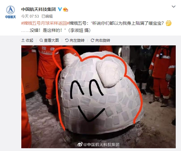 这趟“快递”取得不容易,连着陆场上的小动物都第一个来迎接。还有个细节很有意思,为了让刚刚到家的返回器保持温度,降低后续处置难度,地面工作人员给它上上下下贴满了暖宝宝。没错,真的是暖宝宝,大家都说,最高端的装备用上最朴素的保暖方式,整挺好!