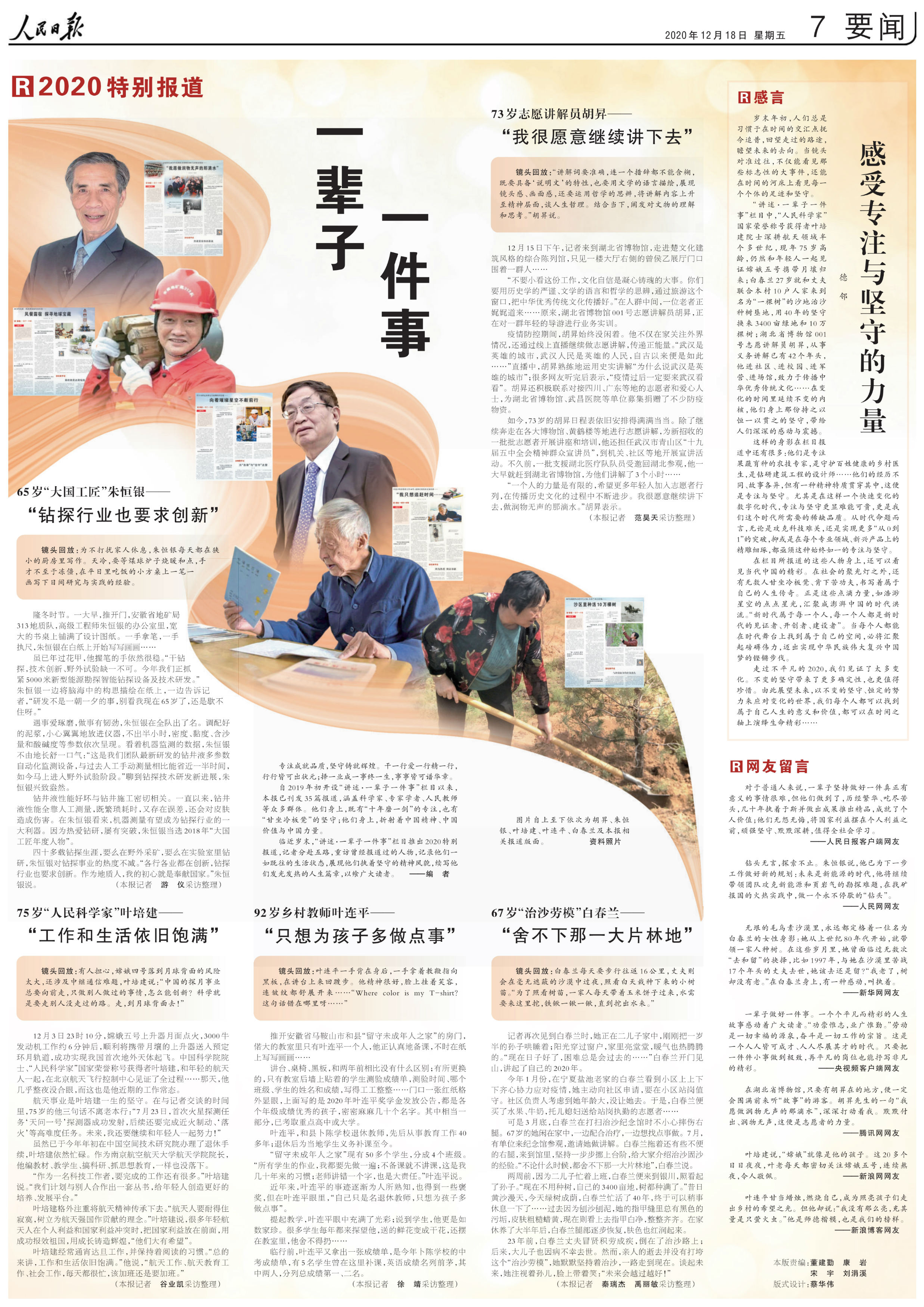 自2019年初开设“讲述·一辈子一件事”栏目以来,本报已刊发35篇报道,涵盖科学家、专家学者、人民教师等众多群体。他们身上,既有“十年磨一剑”的专注,也有“甘坐冷板凳”的坚守;他们身上,折射着中国精神、中国价值与中国力量。