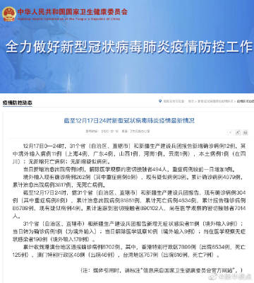 截至12月17日24时,据31个省(自治区、直辖市)和新疆生产建设兵团报告,现有确诊病例304例(其中重症病例8例),累计治愈出院病例81851例,累计死亡病例4634例,累计报告确诊病例86789例,现有疑似病例4例。累计追踪到密切接触者890102人,尚在医学观察的密切接触者7014人。