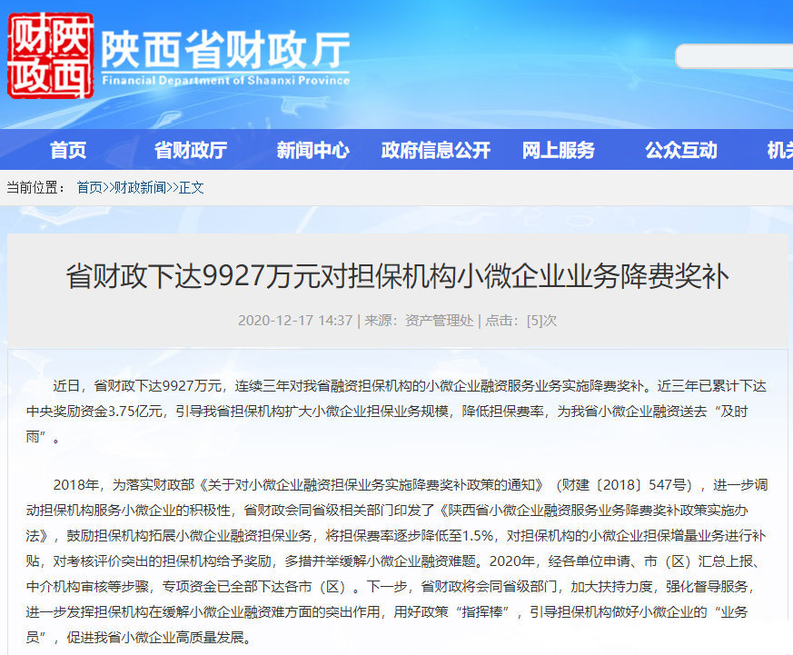 近日,陕西省财政下达9927万元,连续三年对陕西省融资担保机构的小微企业融资服务业务实行降费奖补。近三年已累计下达中央奖励资金3.75亿元,引导陕西省担保机构扩大小微企业担保业务规模,降低担保费率,为陕西省小微企业融资送去“及时雨”。