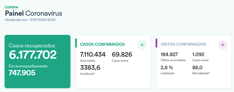 截至当地时间12月17日,根据巴西卫生部发布的数据,巴西新冠肺炎确诊病例累计达到7110434例,比前一日新增69826例;新增死亡病例1092例,累计死亡病例184827例;累计治愈病例6177702例。