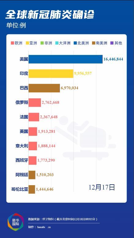 世界卫生组织:截至欧洲中部时间17日17时05分(北京时间18日零时05分),全球确诊病例较前一日增加642738例,达到72851747例;死亡病例增加12407例,达到1643339例。